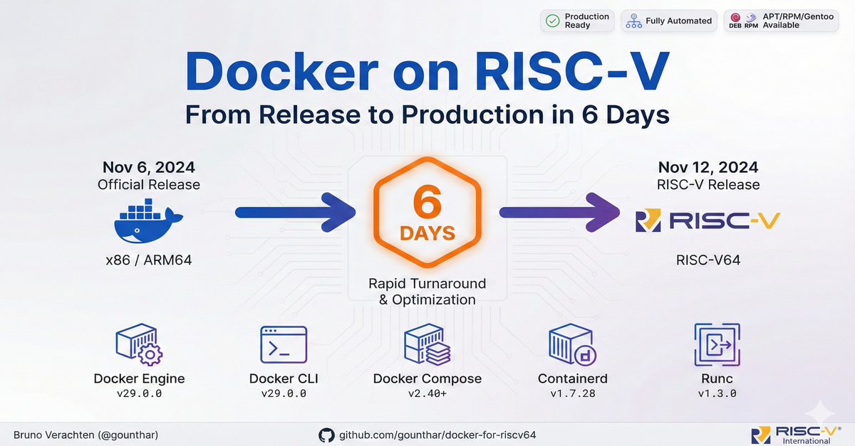 Community-maintained Docker packages bring v29 to RISC-V64 within days of official release, not months. Fully automated pipelines compile natively on RISC-V hardware, delivering Docker Engine, CLI, Compose, and Buildx with complete feature parity. No compromises, no special cases. RISC-V is now a first-class citizen in the container ecosystem.